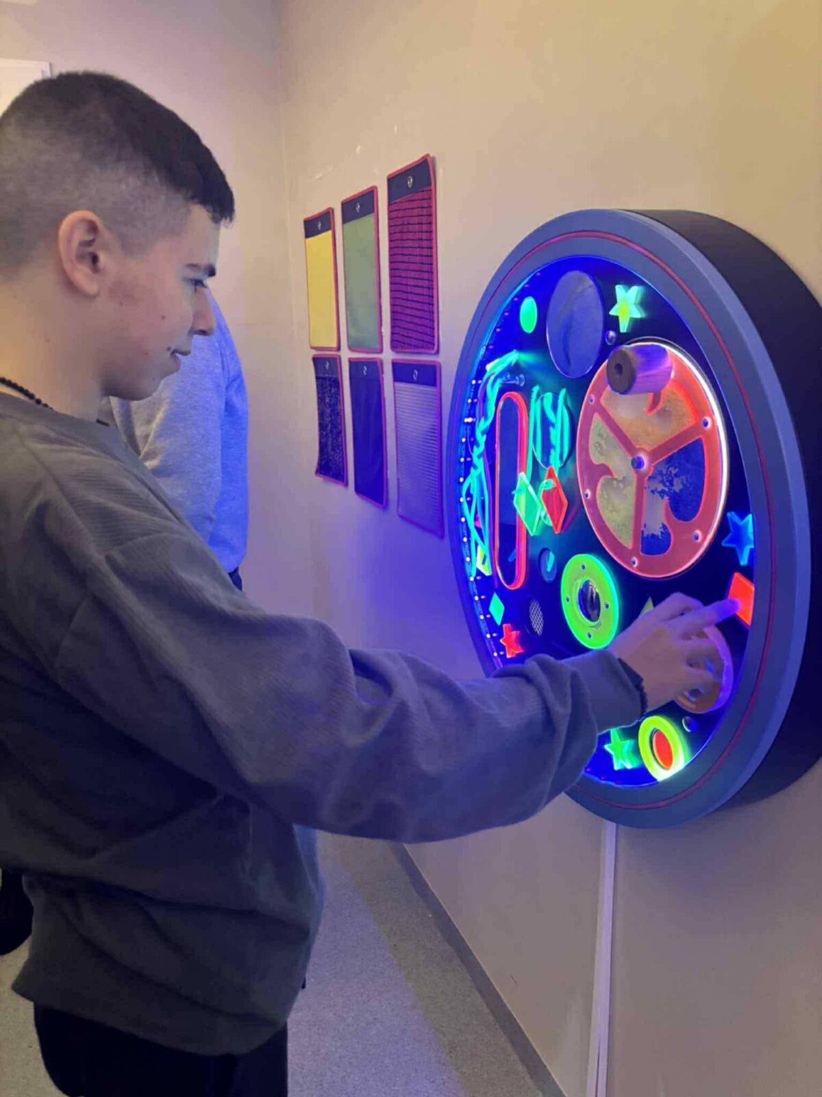 Svečiai leidosi į pažintinę kelionę po mokyklos erdves — žvalgėsi, šypsojosi, dalijosi savo įspūdžiais ir pastebėjimais. Viena įdomiausių stotelių tapo sensorinis kambarys, į kurį užsukus tarsi atsivėrė ramybės ir atradimų oazė.