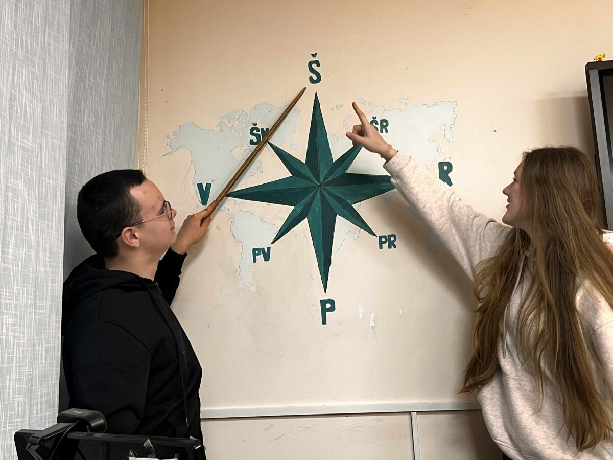 Paskatinti meilės geografijai, bendradarbiaudami su dailės mokytoja Audrone, mokiniai ant kabineto sienos nupiešė pasaulio krypčių rodykles – kompasą, kuris puošia kabinetą, padeda lengviau susigaudyti pasaulio kryptimis.