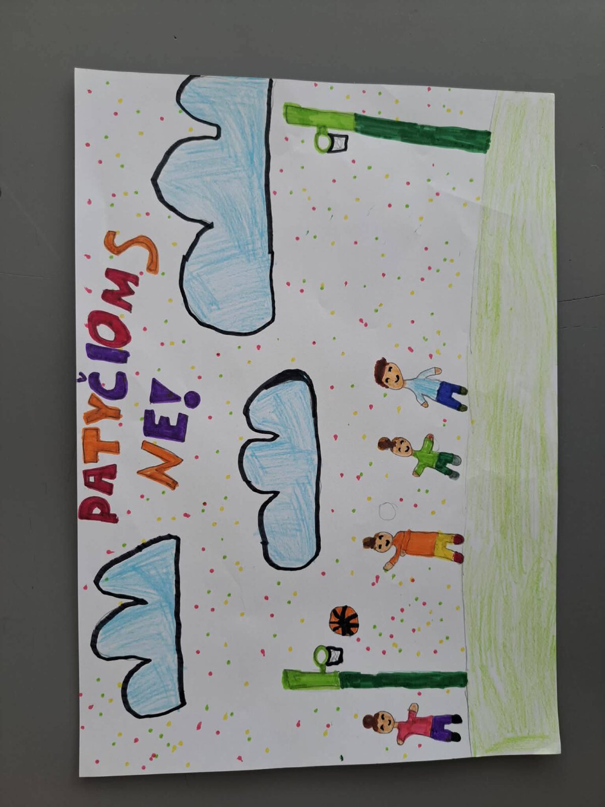 Pažiūrėję filmuką apie patyčias, vardino matytas patyčių formas, piešė piešinius tema „PATYČIOMS NE“!