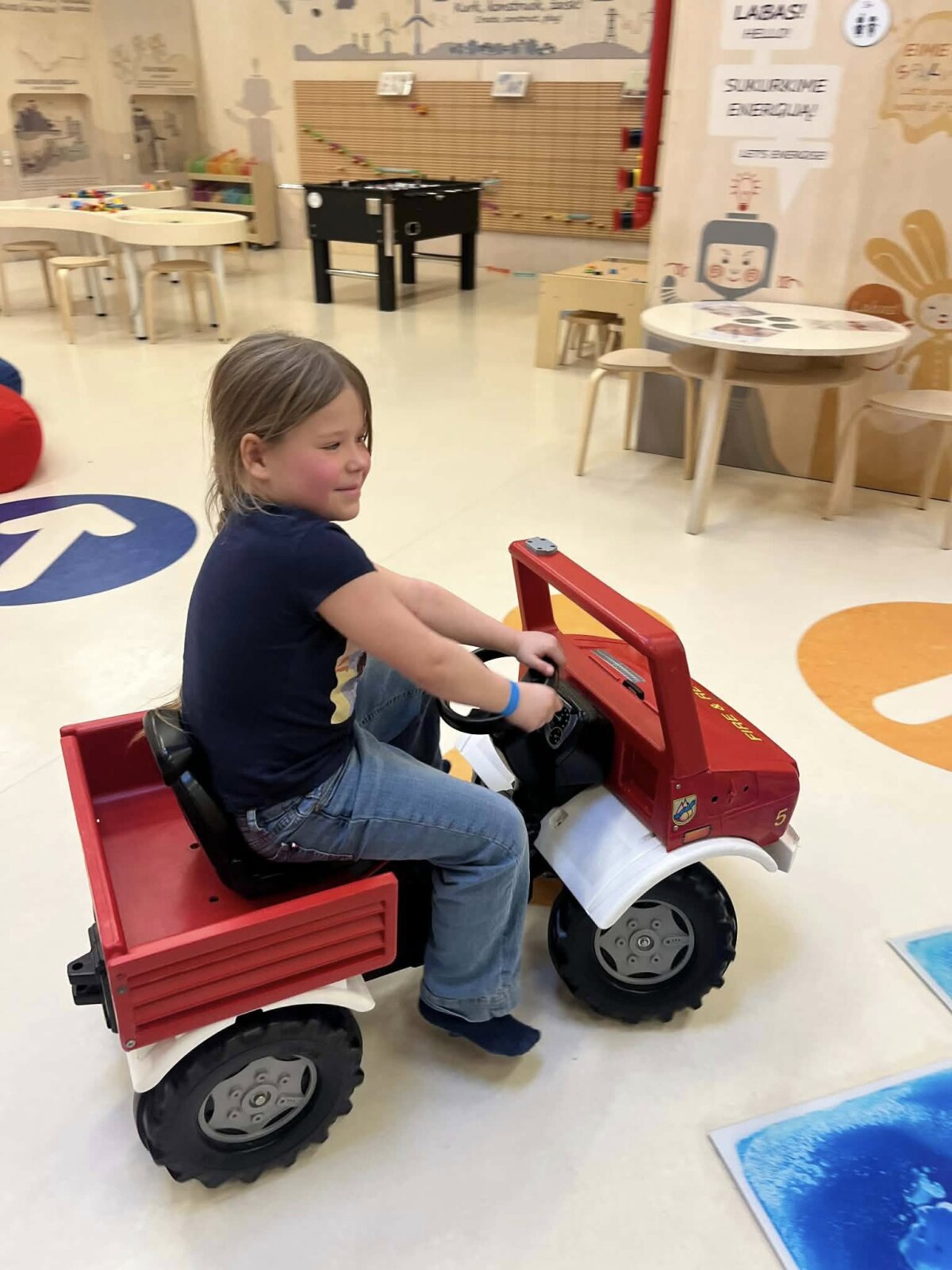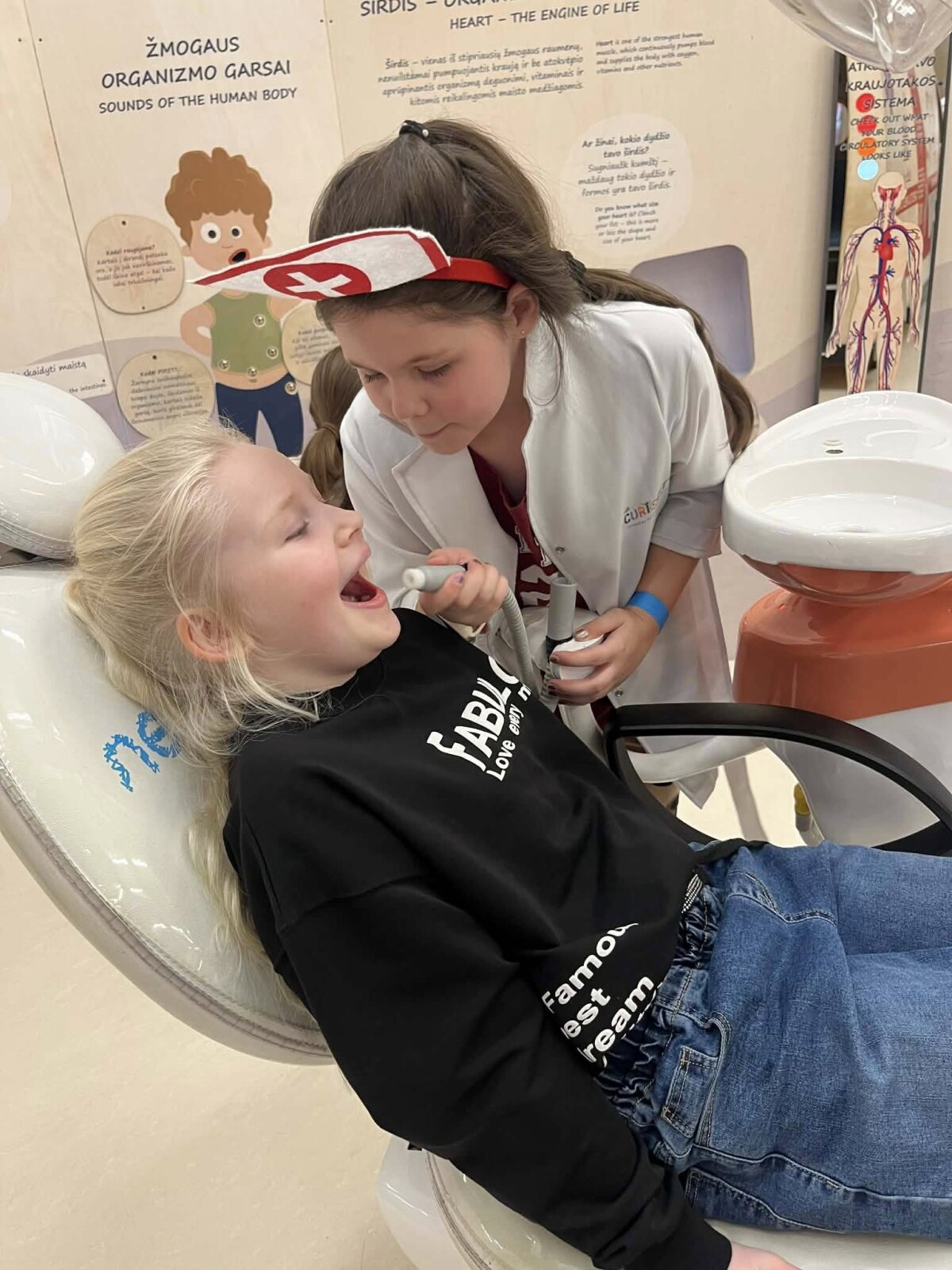 Vėliau vykome į žaidimų miestelį. Emocijų pilni tapo gydytojais, policininkais, gaisrininkais, statybininkais ir kitų profesijų atstovais. Dūko iki valios.