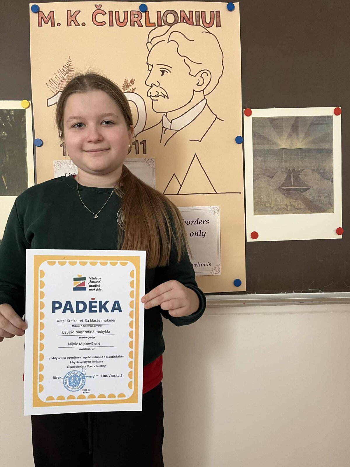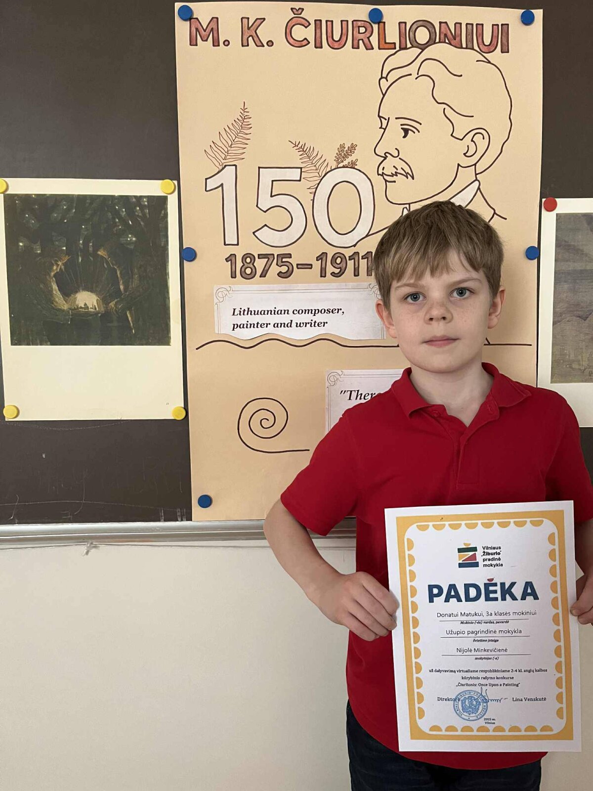 3a klasės mokiniai Viltė Kreizaitė ir Donatas Matukas dalyvavo šalies kūrybinio rašymo konkurse „Čiurlionis: once upon a painting“. Jie kūrė stebuklines pasakas, įkvėpti M. K. Čiurlionio paveikslų reprodukcijų: Viltė pasirinko paveikslą „Jūros sonata“, o Donatas– „Karalių pasaka“. Mokiniai stengėsi perteikti paveikslų nuotaiką, detales ir istorijos atmosferą.