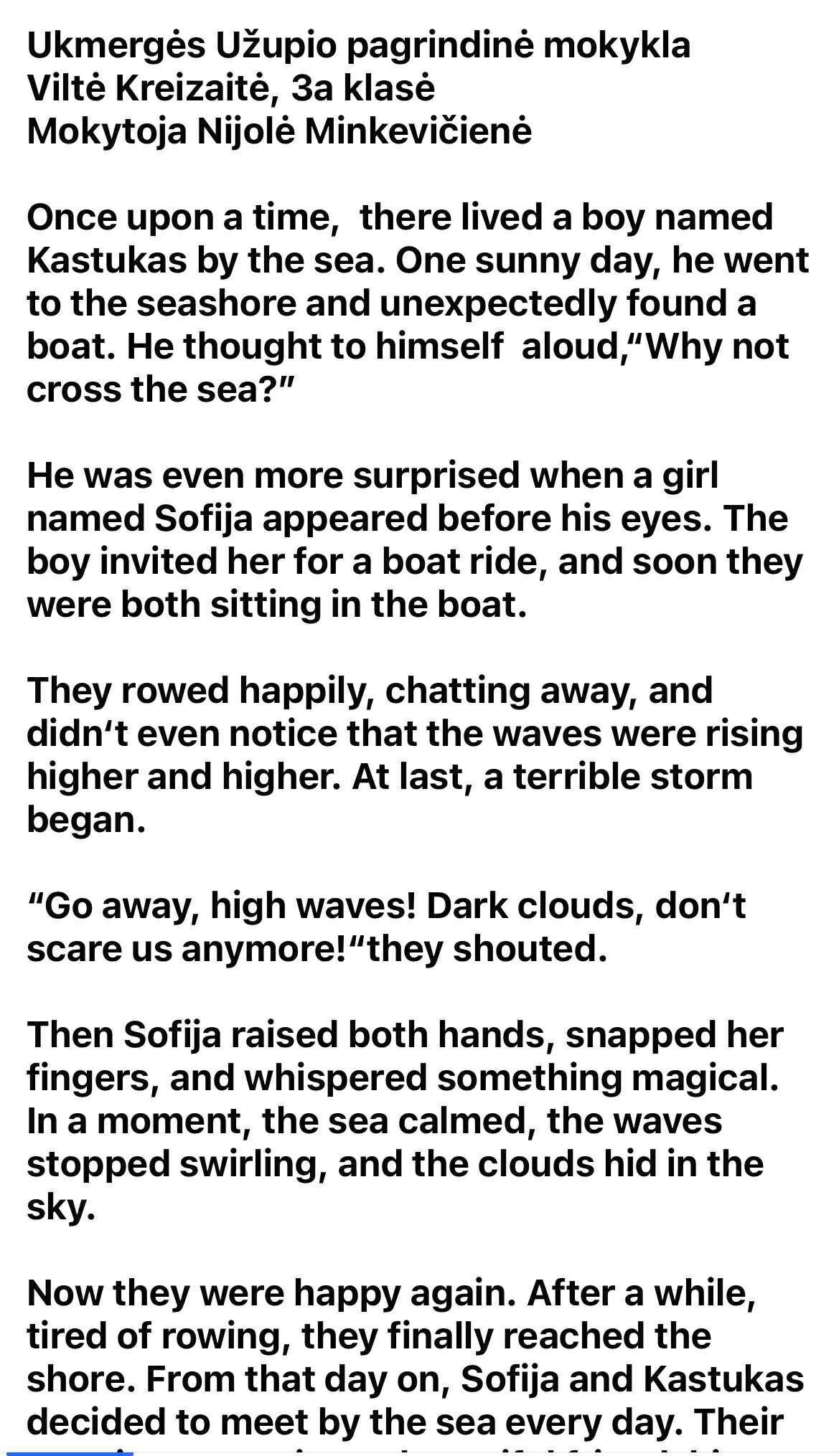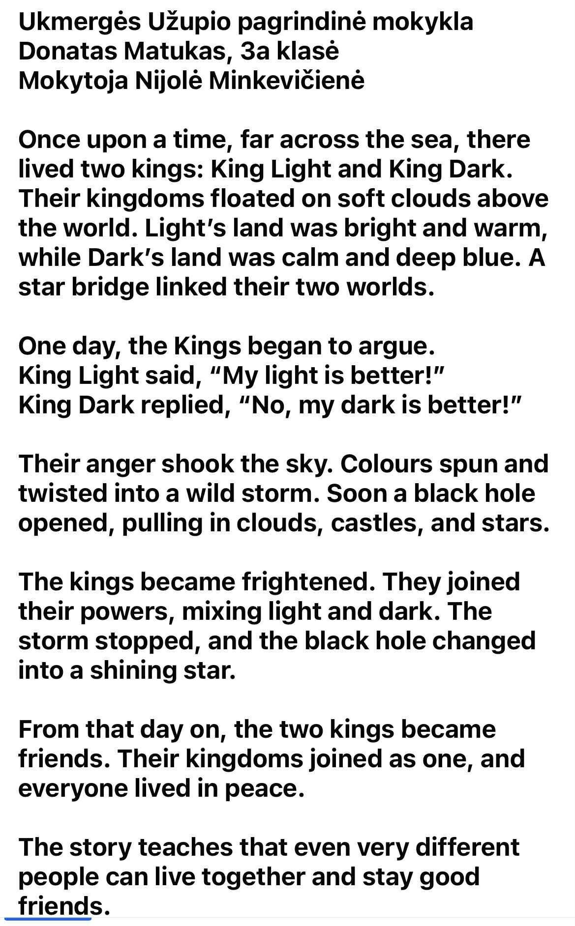 Mokiniai kruopščiai kūrė ir ne kartą redagavo savo tekstus. Džiaugiuosi, kad Viltė ir Donatas savaip prisilietė prie M.K. Čiurlionio palikimo. Taip jie atrado, kad M. K. Čiurlionio kūryba ne tik įkvepia, bet ir moko žvelgti į pasaulį kūrybingai. Tegul pasakų pasaulis ir toliau mokinius įkvepia kurti, svajoti ir tikėti stebuklais.
