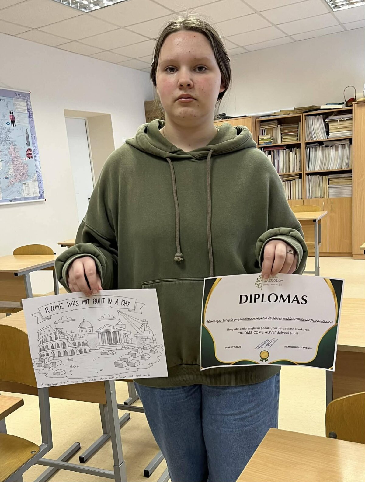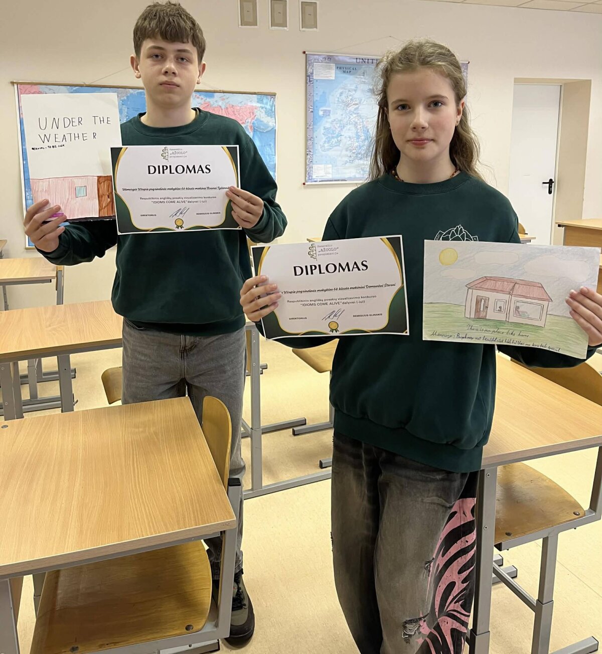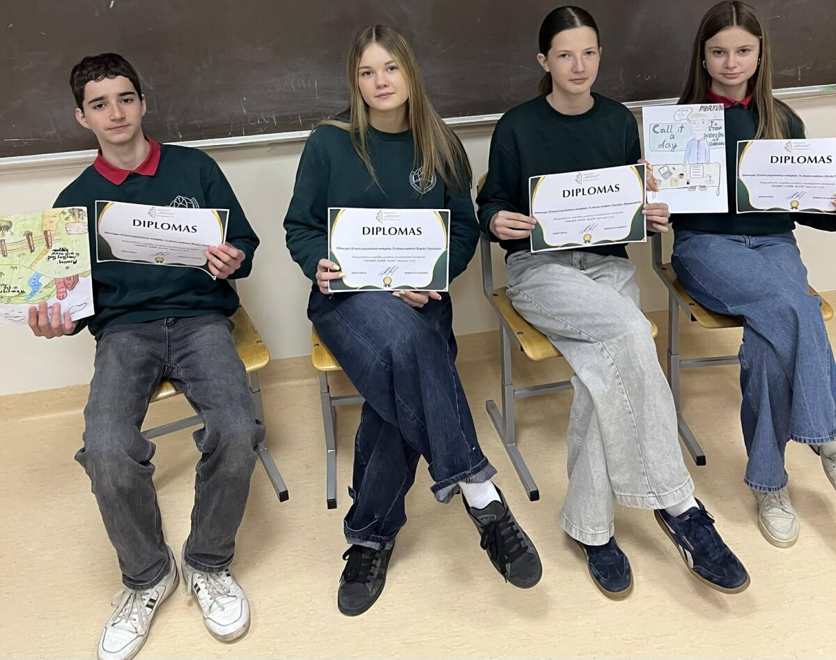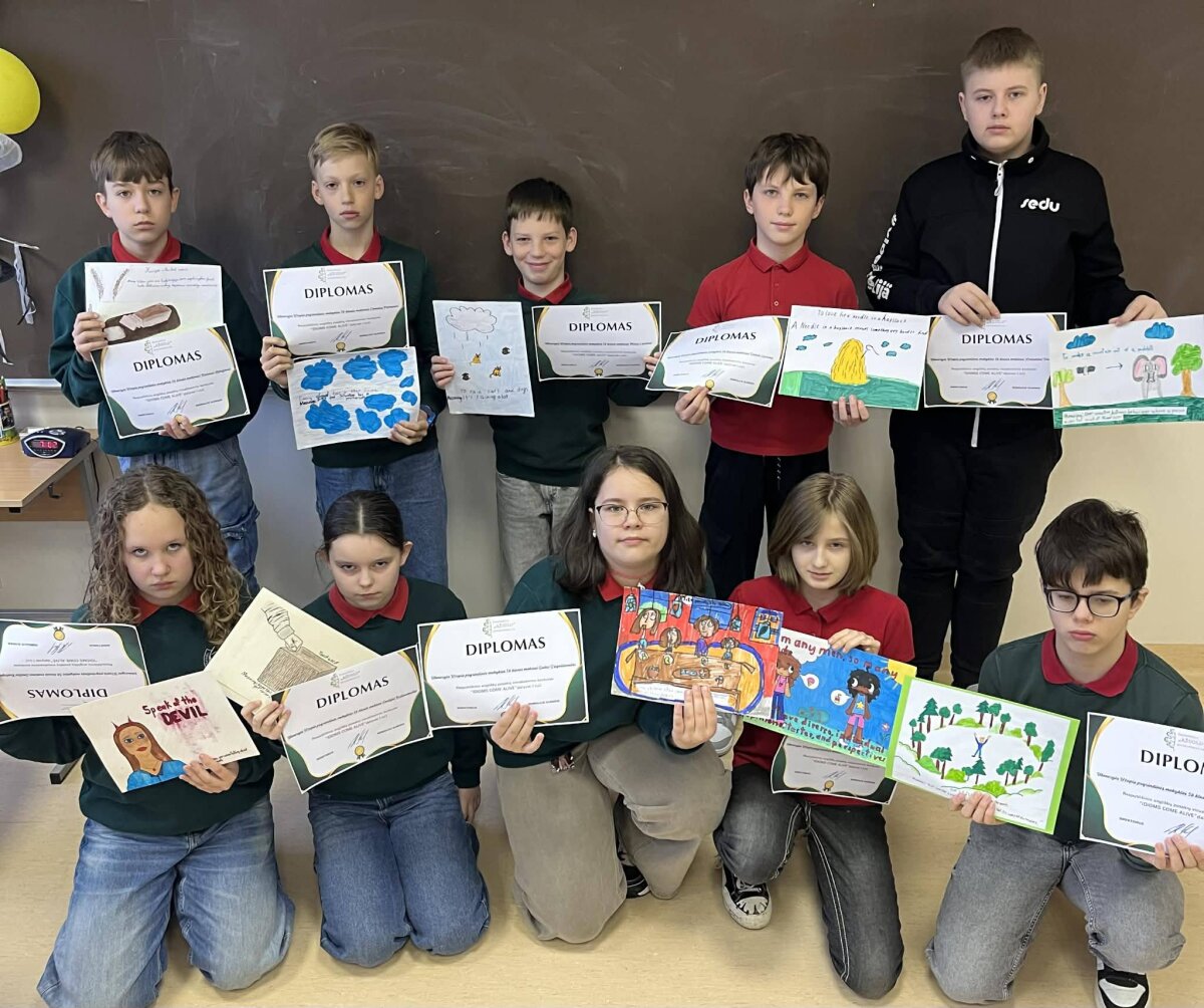 Savo kūrybiškumą jie pademonstravo šalies angliškų posakių vizualizavimo konkurse. Rezultatas džiuginantis – darbai įvertinti diplomais, o mokytoja sulaukė padėkos už įkvepiantį ir įtraukiantį mokymą.
