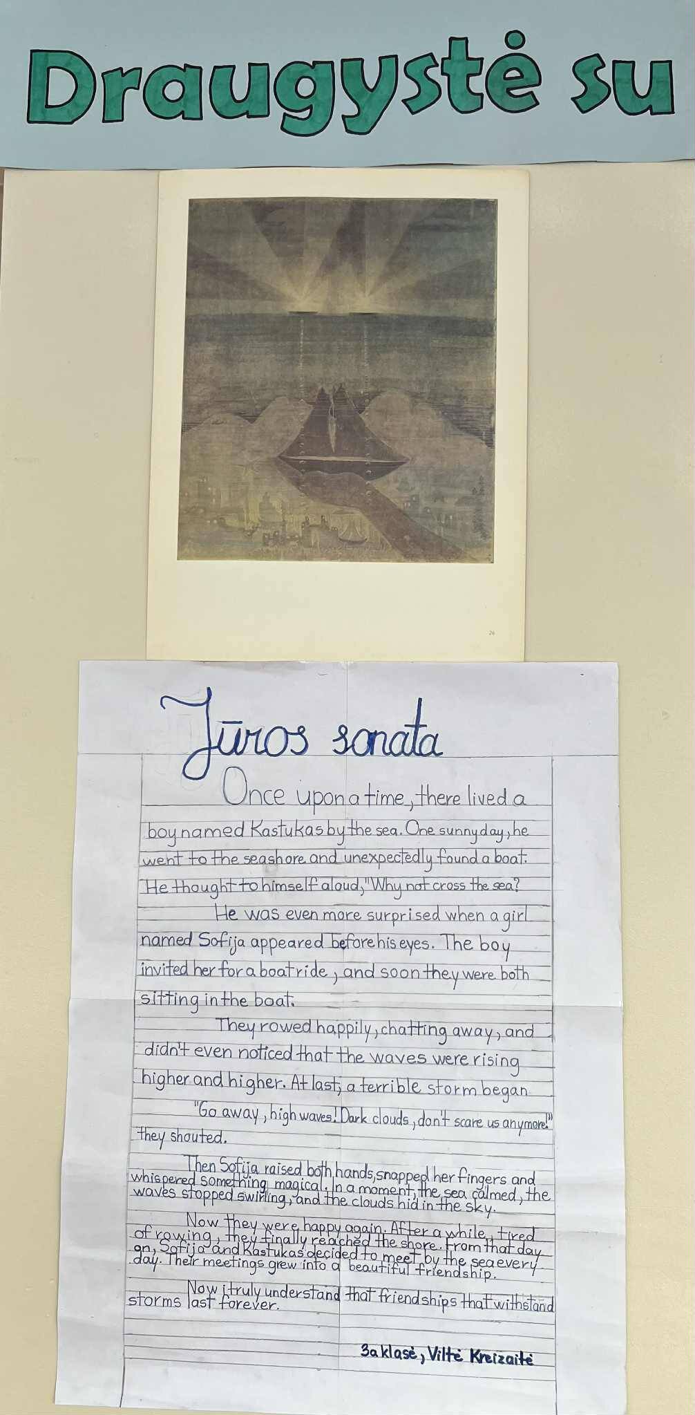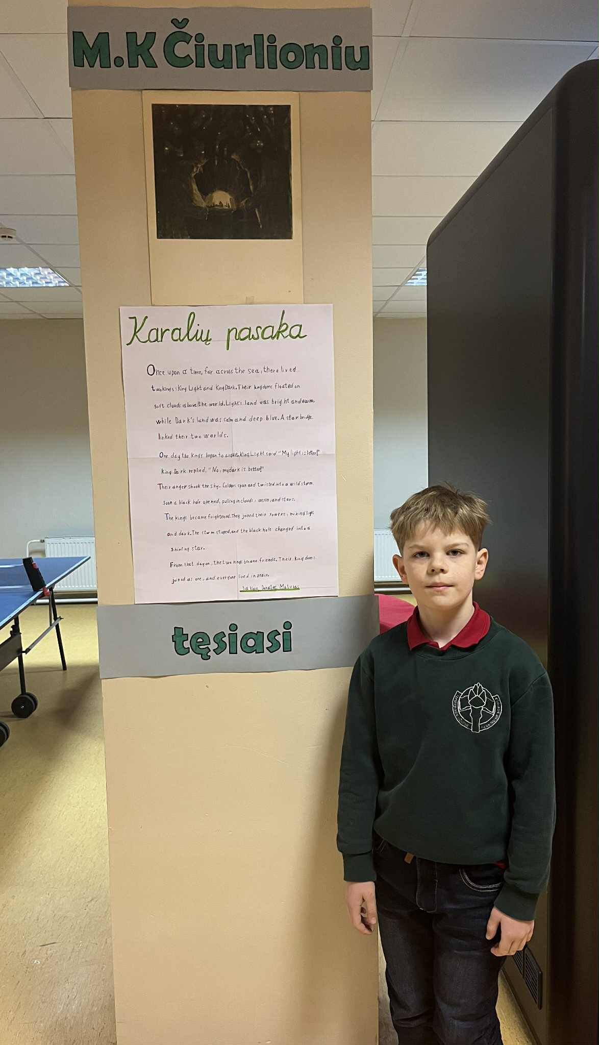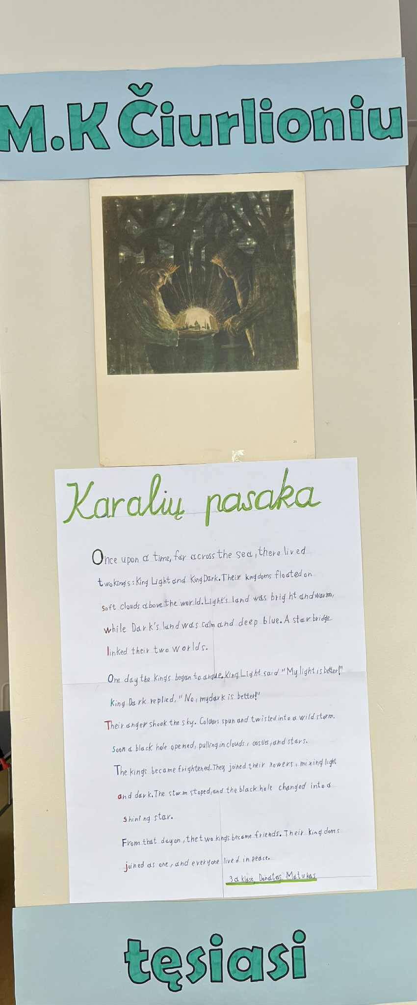 M. K. Čiurlionio paveikslai mokyklos erdvėje prabyla 3a klasės mokinių Viltės Kreizaitės ir Donato Matuko stebuklingomis pasakomis, kurias jie kūrė kartu su anglų kalbos mokytoja Nijole Minkevičiene, atverdami savo fantazijos pasaulį.