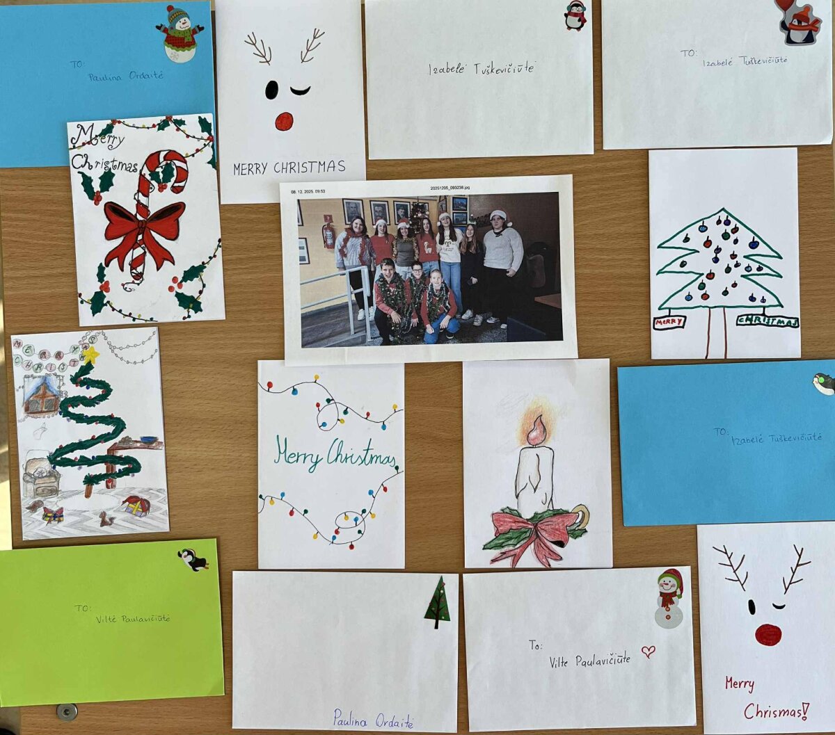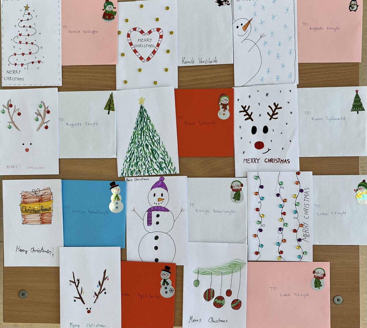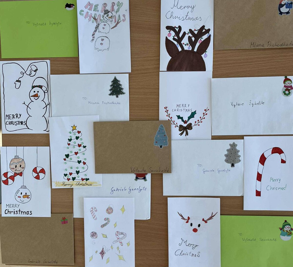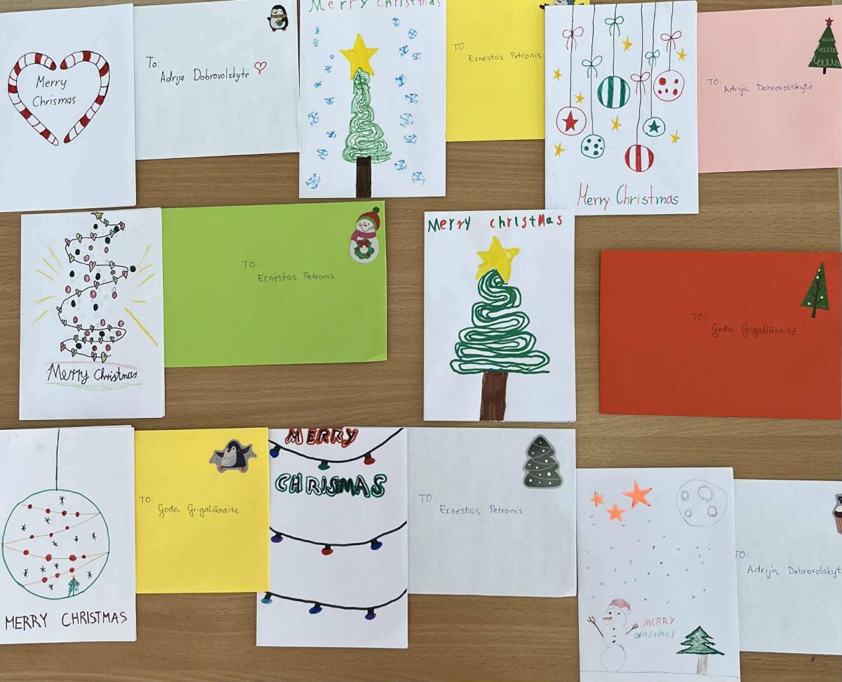 Anglų kalbos mokytojos Nijolės Minkevičienės 3-7 klasių mokinių šventiniai sveikinimai draugus iš Kroatijos pasiekė šiek tiek anksčiau, o dabar, po ilgo laukimo, mokiniai su dideliu džiaugsmu sulaukė atsakymo – rankų darbo kalėdinių atvirukų iš savo naujų draugų. Kiekviename atviruke – pačių mokinių parašyti šventiniai linkėjimai ir po kelias asmeniškas mintis. Džiaugiamės užsimezgusia draugyste ir tikime, kad ji tęsis – mokiniai galės tobulinti anglų kalbos žinias susirašinėdami individualiai, o ryšį palaikys ir mokytojos. Gauti atvirukai bus eksponuojami mokyklos erdvėje.
