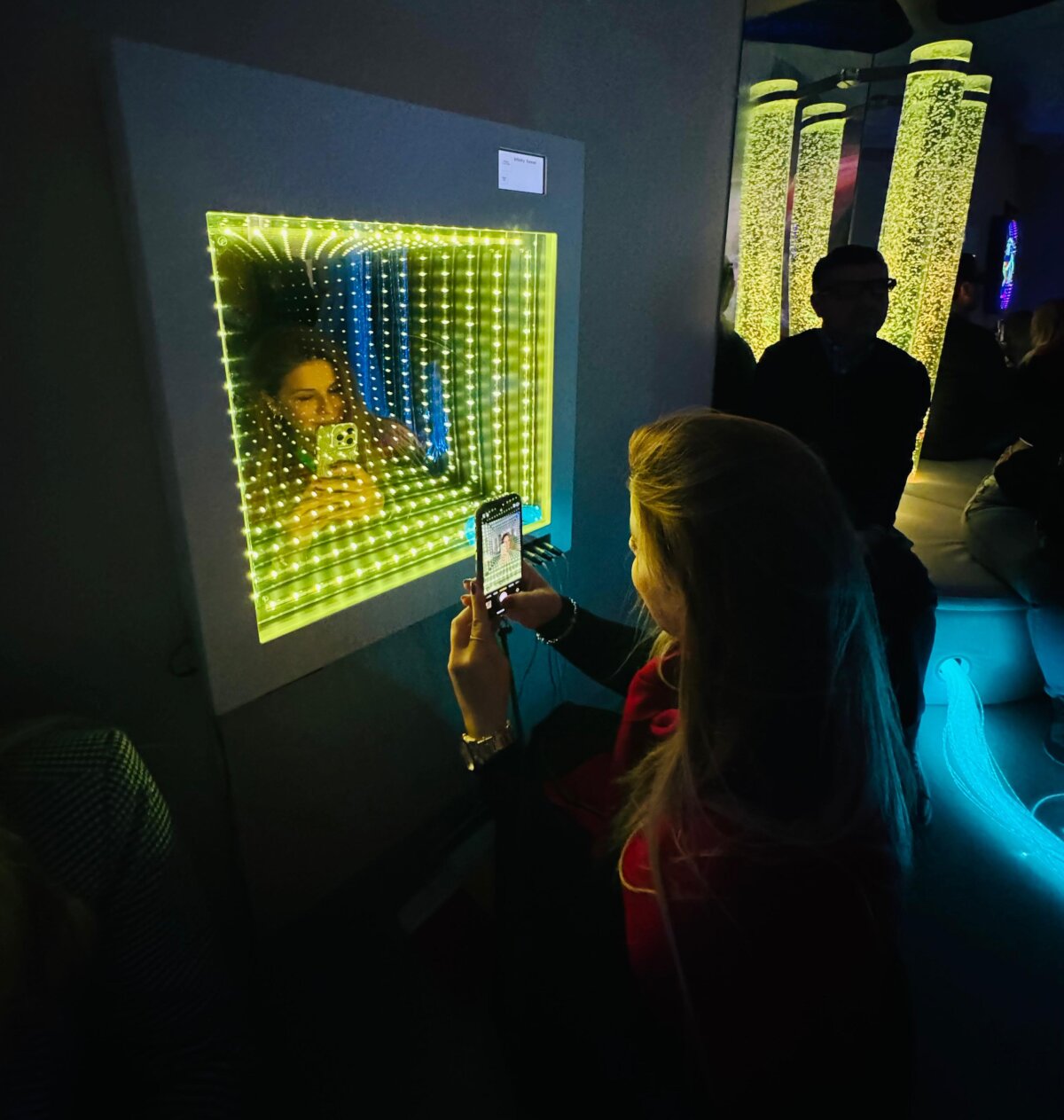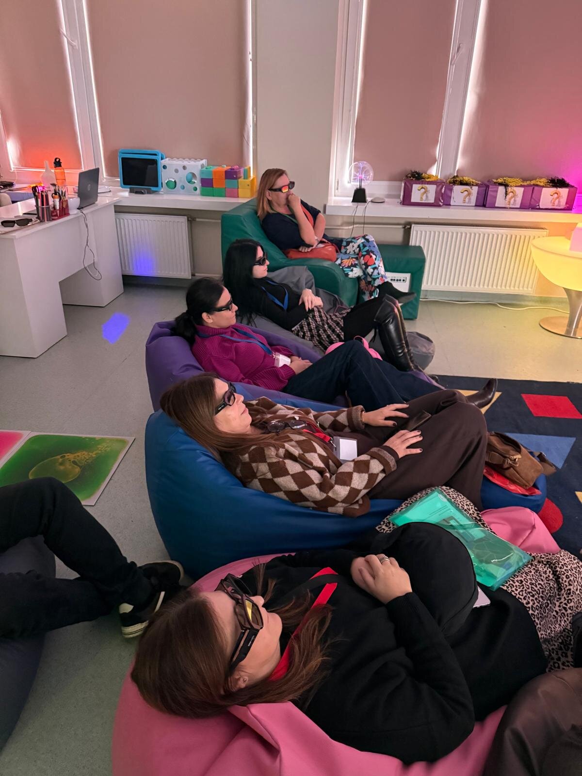 Po visų intensyvių veiklų projekto dalyviai atsipalaidavo sensoriniame kambaryje, kur mokinio padėjėja Vita Jurkėnė pravedė nedidelį terapijos seansą. Aromatai, spalvos, muzika – tikra meditacijos pertrauka tarp DI technologijų!