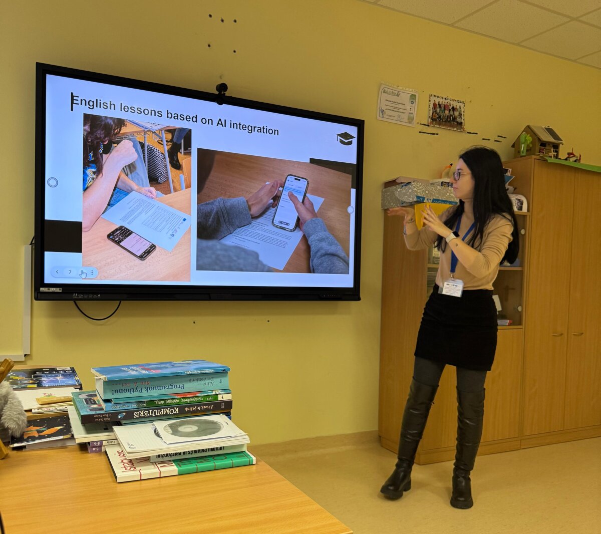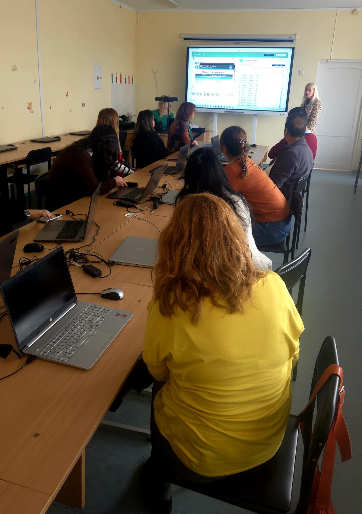 Mokyklos projektų koordinatorė ir informatikos mokytoja Virgilija Markevičienė kartu su anglų kalbos mokytoja Rusne Valeikiene vedė interaktyvias veiklas, pristatydamos DI galimybes skaitymo įgūdžiams stiprinti. Dalyviai išbandė: