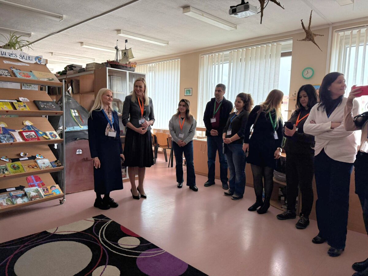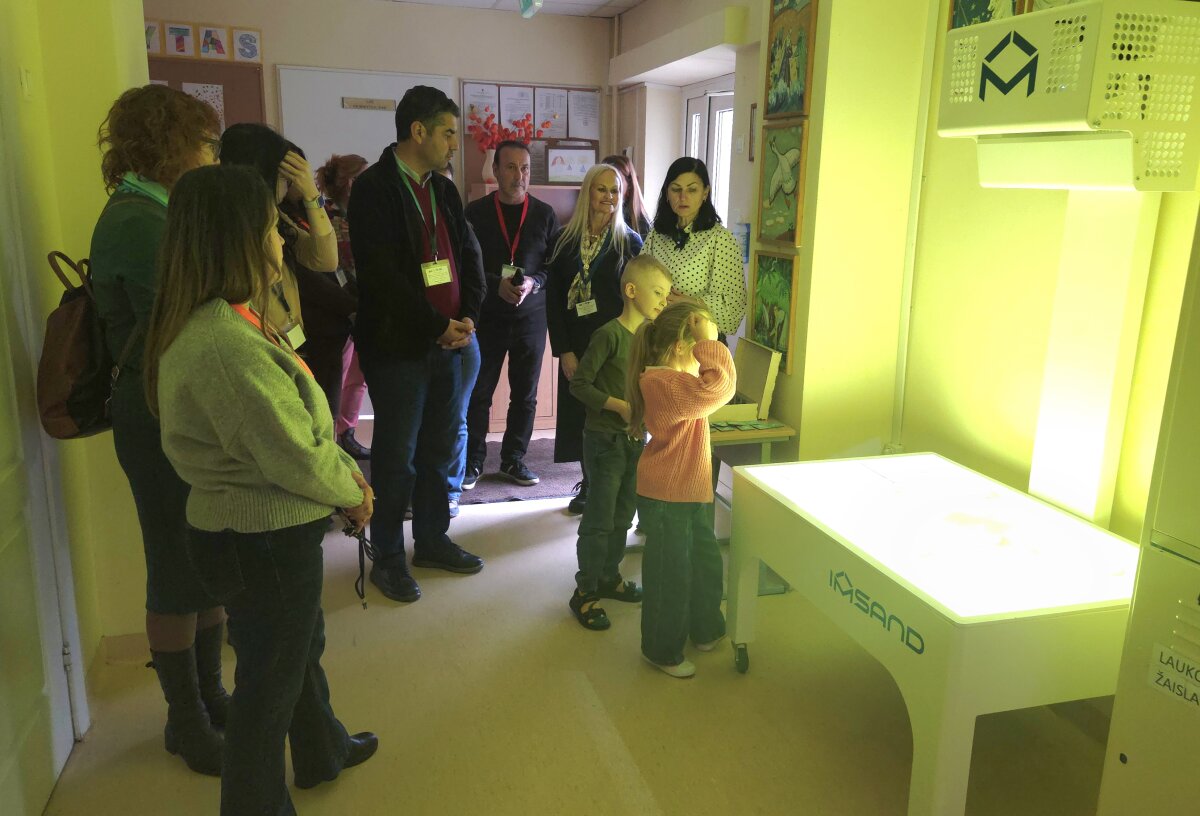 Ikimokyklinių klasių veiklas pristatė mokytojos Giedrė Pažūsienė ir Vilma Šlubelienė. Svečiai ne tik apžiūrėjo aktyvias lauko zonas, bet ir išbandė interaktyvią smėlio dėžę – o tai, pasirodo, džiugina ne tik vaikus.