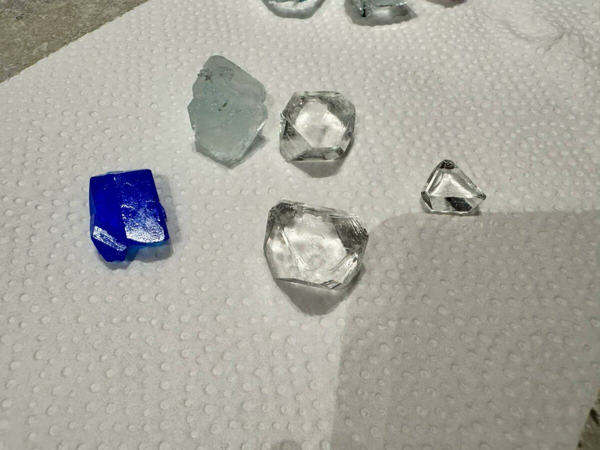 Eksperimento metu mokinės ruošė specialius tirpalus, kantriai laukė ir stebėjo, kaip pamažu formuojasi kristalai. Nors pradžioje reikėjo nemažai kruopštumo ir kantrybės, rezultatai tikrai nudžiugino – išaugo įvairių formų ir spalvų kristalai.