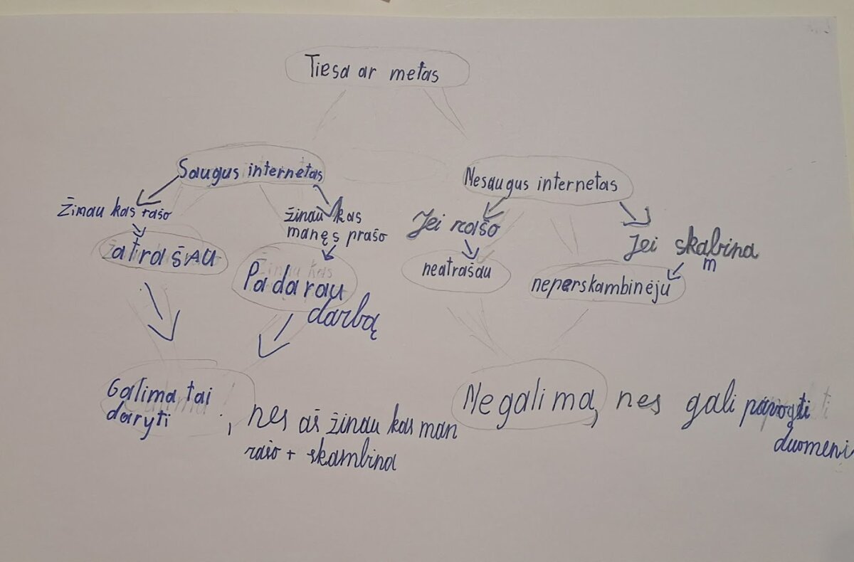 Vasaris – tas mėnuo, kai internetas mokykloje tampa ne tik priemone, bet ir tema. 2026 m. Saugesnio interneto savaitė Lietuvoje minima vasario 9–14 d., o pasaulinė Saugesnio interneto diena akcentuojama vasario 10-ąją – kvietimas paprastas: kurti geresnį internetą kartu (https://www.prisijungusi.lt/naujienos-2/saugesnio-interneto-savaite-2026). Prie šios iniciatyvos prisidėjo ir Ukmergės Užupio pagrindinės mokyklos 3a klasės mokiniai kartu su mokytoja Daiva Butkiene. Šią savaitę mūsų trečiokai pradėjo nuo labai gyvenimiško klausimo: ką jūs veikiate elektroninėje erdvėje? Ir čia pasimatė tikras klasės „interneto žemėlapis“ (apklausoje dalyvavo 18 mokinių): žaidimus žaidžia 15 iš 18 (83 %), „YouTube“ įrašus stebi 14 (78 %), su draugais internetu bendrauja 14 (78 %), o socialinius tinklus naudoja 11 (61 %). Skaičiai paprasti, bet jie iškart parodo – vaikų skaitmeninis gyvenimas jau vyksta, vadinasi, apie saugumą kalbėti reikia ne „kada nors“, o dabar. „Ar žinote, kad internete paliekate savo asmeninį pėdsaką?“ Kai pasakėme žodžius „skaitmeninis pėdsakas“, klasėje įvyko tas gerasis stebuklas – vaikai sukluso. Pradėjome aiškintis, kas tai yra: nuo nuotraukų ir žinučių iki to, ką apie mus gali pasakyti mūsų pasirinkimai, prisijungimai, paspaustos nuorodos. Mokiniai patys pateikė pavyzdžių, o mokytoja juos papildė – kad skaitmeninis pėdsakas- tai tarsi neištrinamu rašikliu parašyta ir pasidalinta informacija. Vaikai stebėjosi, kad net ištrynus informaciją savo įrenginyje, ji gali likti internete. Trijų šviesoforo spalvų testas: „saugu – abejoju – nesaugu“ Mokiniai gavo korteles su įvairiais „duomenimis“ ir turėjo jas suskirstyti į tris kategorijas: saugu, abejoju (klausiu), nesaugu. Toliau perėjome prie veiklos, kuri vaikams patinka, nes ji leidžia ginčytis argumentais (ir čia ginčai būna labai produktyvūs). Mokiniai susiskirstė poromis, aptarė privačius duomenis, dėl kurių kilo abejonių. Daugiausia mokinių abejojo, ar saugu virtualioje aplinkoje skelbti vardą, klasę, mokyklos pavadinimą, pamokų tvarkaraštį. Diskusijoje išryškėjo svarbiausia pamokos mintis: kai kurie dalykai atrodo nekalti, bet netinkamose rankose gali tapti problema. Vaikai patys įvardijo, kodėl svarbu saugoti asmeninę informaciją – nes ją gali bandyti panaudoti nesąžiningi žmonės, turintys „savų tikslų“. Visi padarė išvadą, kad šiais duomenimis galima dalintis tik saugioje, mokymuisi skirtoje aplinkoje. Privatumo žemėlapis Kompiuterių klasėje mokiniai pritaikė žinias ir tobulindami skaitmenines kompetencijas kūrė privatumo žemėlapius naudojantis bubbl.us įrankiu. Žemėlapiams sukūrė pavadinimą ir išsaugojo aplanke.