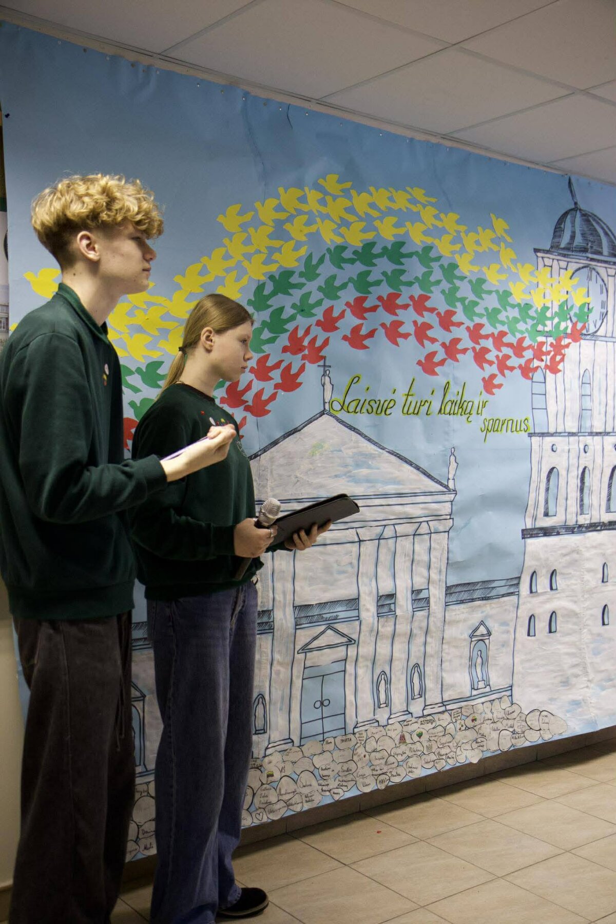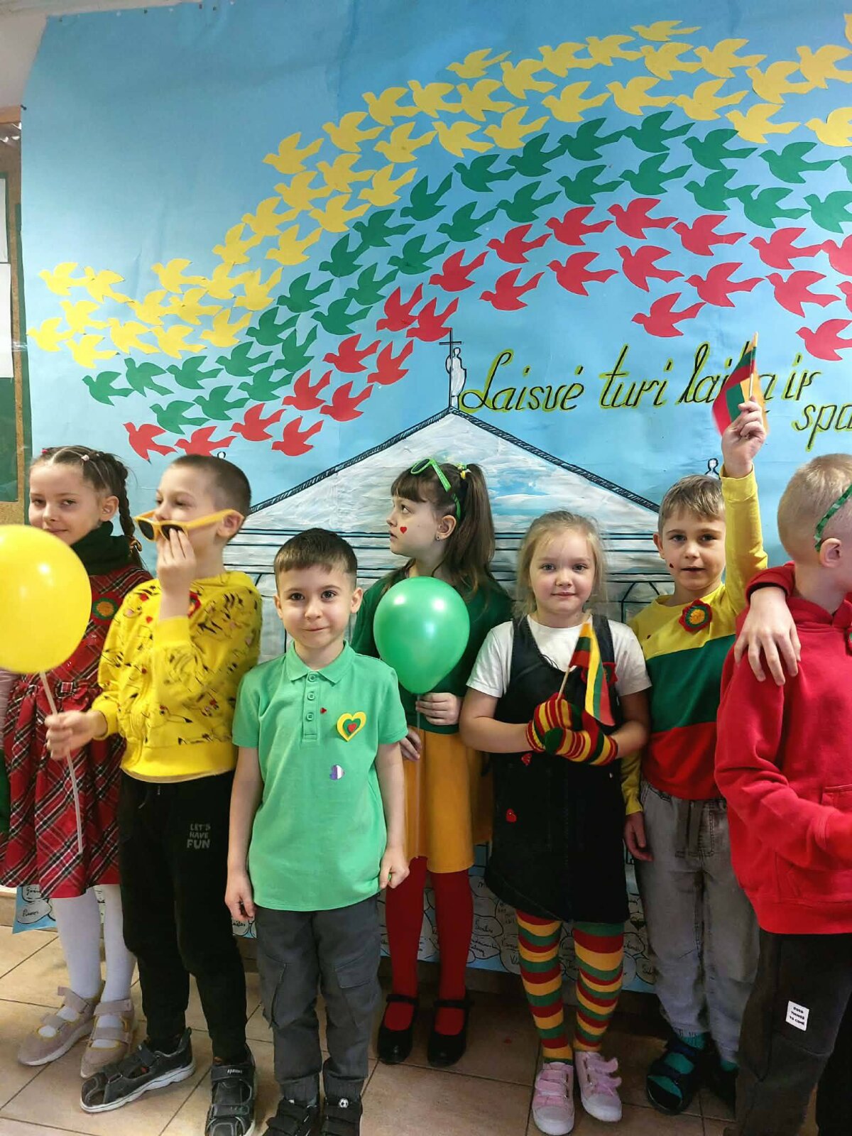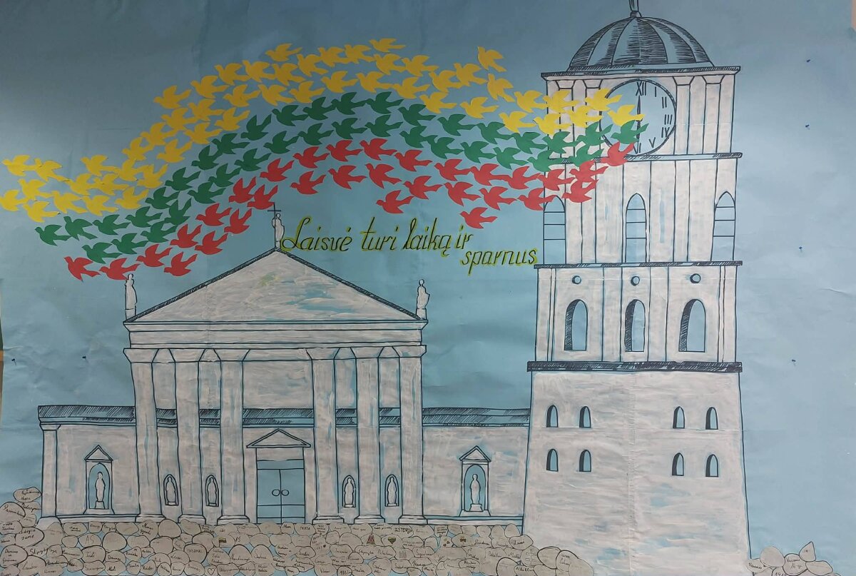 Minėdami Valstybės atkūrimo dieną, mūsų mokyklos bendruomenė susibūrė šventiškai papuoštoje foje. Čia mokinių ir mokytojų dėmesį traukė mokytojos Deimantės ir mokinių paruošta įspūdinga instaliacija – Vilniaus arkikatedra ir jos varpinė, iš kurios į dangų kilo paukščiai, nuspalvinti Lietuvos trispalvės spalvomis, simbolizuojantys laisvę ir vienybę.