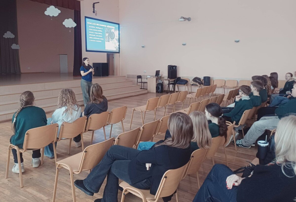 Paskutinę mokslų savaitę prieš atostogas šeštokai susitiko su Vilniaus Gedimino technikos universiteto (Vilnius TECH) atstove, pirmakurse Guste Mackonyte. G. Mackonytė – kraštietė, šiuo metu universitete studijuojanti aviaciją. O į mokyklą ji atvyko pakviesta pristatyti pranešimą ,,Ateities kūrėjai: kokias profesijas rinksis rytojus?“