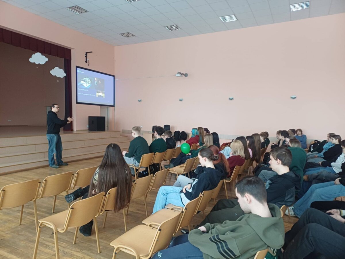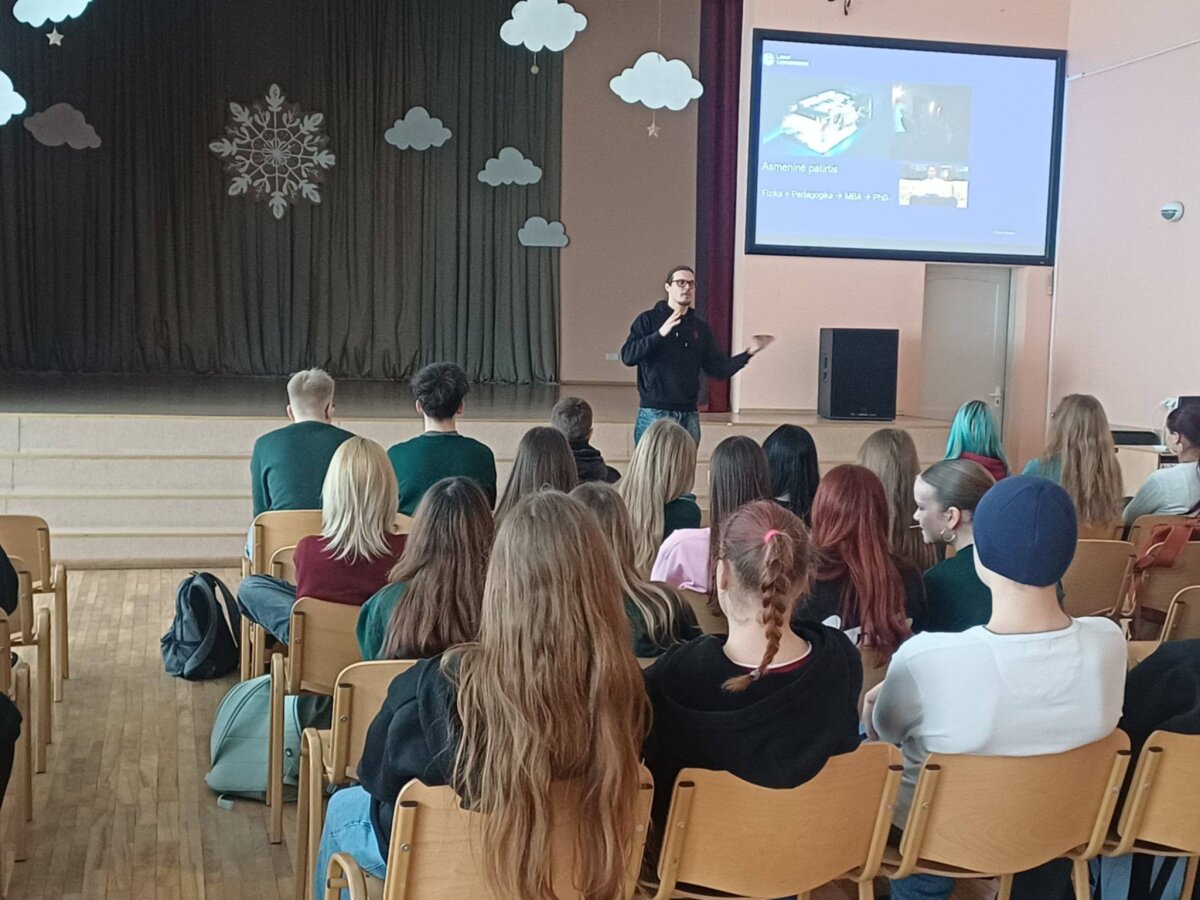 Mūsų mokykloje svečiavosi Adomas Kačiušis – Vilniaus universiteto filosofijos fakulteto doktorantas, fizikas, lazerių specialistas, pedagogas. A.Kačiušis dalinosi su vyresniųjų klasių mokiniais savo darbo patirtimi, pasakodamas apie veiklas, kuriomis užsiima, apie kartu su komanda kuriamus vienus geriausių lazerių pasaulyje, apie tai, kiek galima iš vienų ir kitų veiklų uždirbti ir kuo vienos kitoms gali pasitarnauti iš pažiūros skirtingos studijos kryptys. Labiausiai nustebino tai, kad į mokinių užduotą klausimą, kokia veikla jam pačiam artimiausia, atsakė, jog darželio auklėtojo patirtis – viena nuostabiausių jo gyvenime, o pedagogo darbas – širdžiai mieliausias ir kad šioje profesinėje srityje mato didžiausia prasmę.