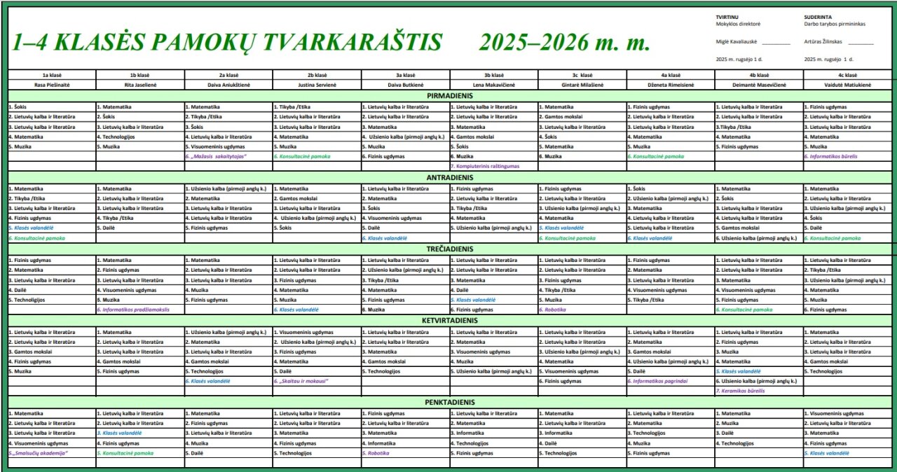 Pamokų tvarkaraštis 1-4 klasių 2025-2026 m. m.